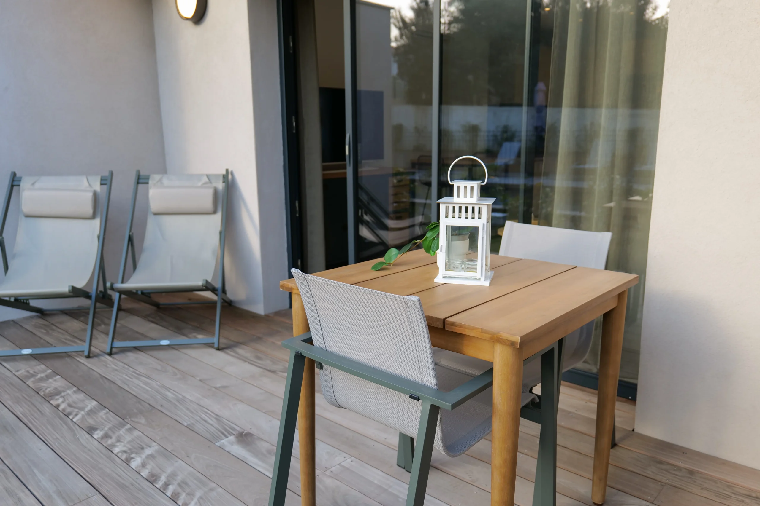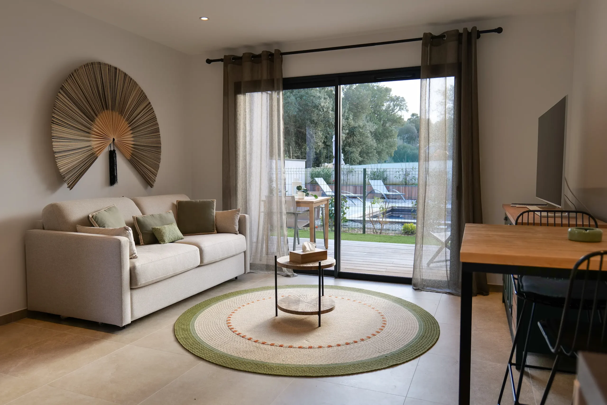 À l’extérieur, laissez-vous séduire par la terrasse en bois équipée d’une table et de ses chaises, ainsi que deux juliennes, pour vos moments de détente et vos pauses gourmandes, votre cocoon estival !