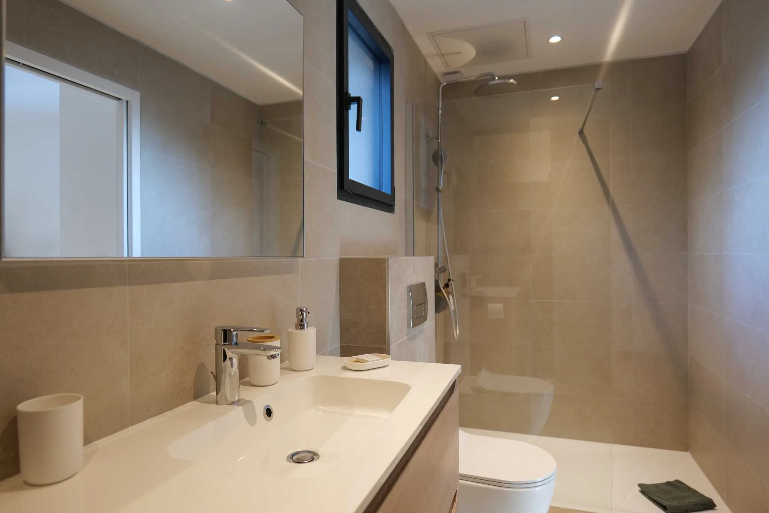 Profitez d’une salle d’eau moderne, équipée d’une douche à l’italienne, d’une meuble vasque avec tiroirs intégrés, d’un WC, et d’un espace buanderie avec lave-linge / sèche-linge.
